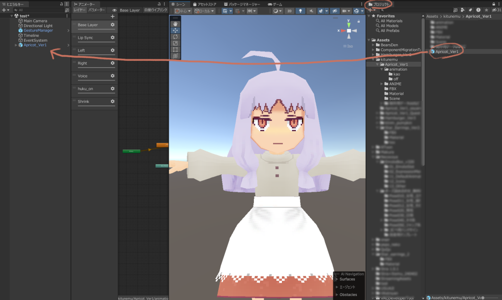 更にその中の「Apricot_Ver1(プレハブアセット)」をヒエラルキーにドロップします。