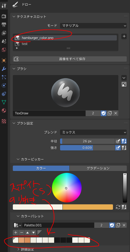 「S」キーでスポイト、「S」を離すと色が戻るがカラーパレットに保存されている。