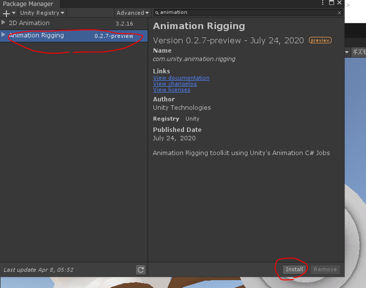 ウインドウ→「Package Manager」→「Unity Registry」から「Animation Rigging」をインストール