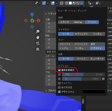 ビューポートシェーディングをオブジェクト以外にすると透明度が反映される