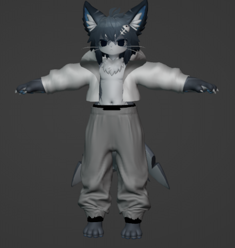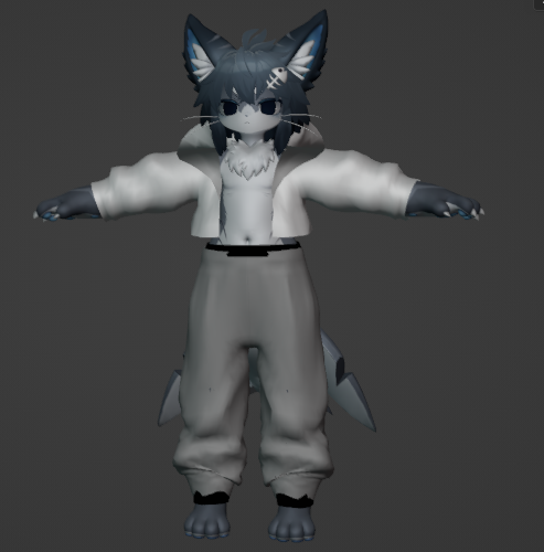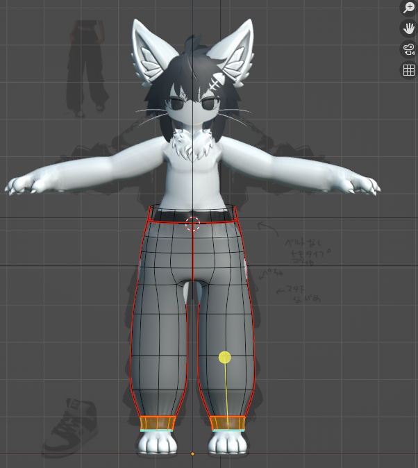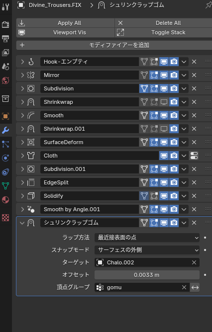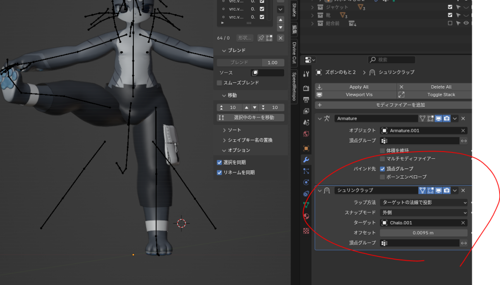 上記で作った仮ズボンにシュリンクラップを適用し、シャロくんの素体と頂点グループを設定