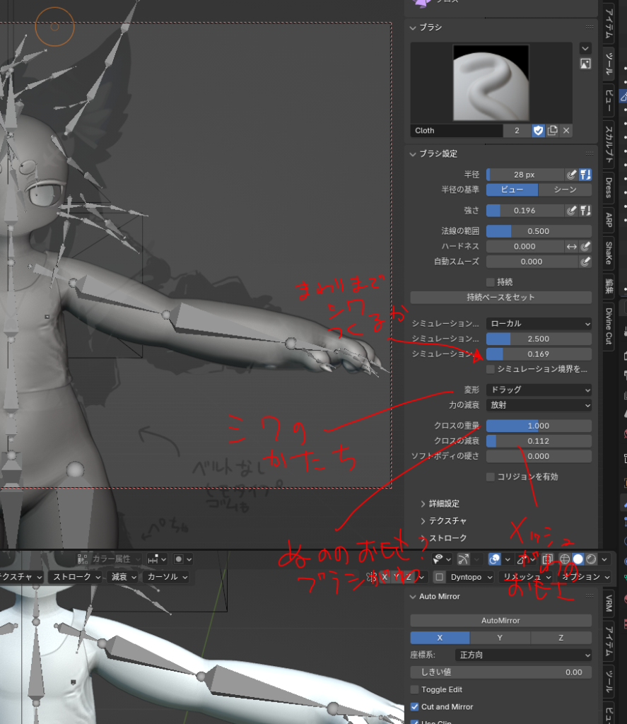 肌メッシュを使う、クロス、スカルプト、自分でメッシュり、ディスプレイスメント…