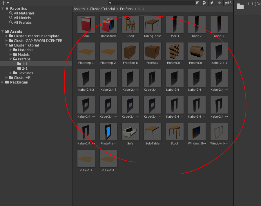 あとサンプルプロジェクトの「ClusterTutorial」→「Prefabs」→「1-1」とか「1-2」